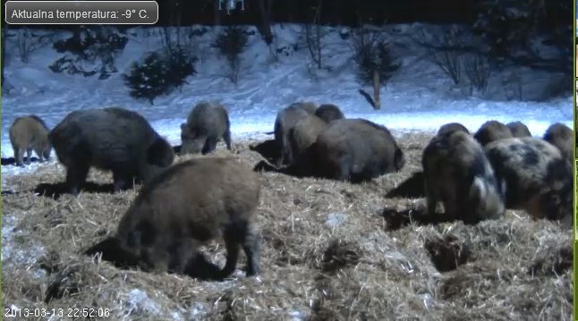 Další krmeliště v lese (Polsko). Je o dost akčnější než to v Etonsku. Napočítala jsem 16 divočáků a momentálně se tam perou. Je to docela sranda. Prý tam chodí i jeleni